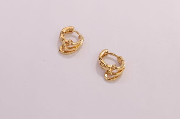 Add a modern edge to your look with these unique gold-plated huggie hoop earrings. This pair offers a fresh take on the classic hoop, designed to sit closely and comfortably on the earlobe. The earrings feature a striking, intertwined double-band design that creates a sense of movement and dimension. The polished gold finish catches the light beautifully, making these small hoops a subtle yet eye-catching statement. They are secured with a simple hinged clasp for a comfortable and secure fit, making them a perfect accessory for everyday wear.