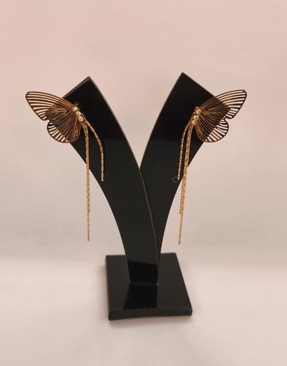 Trendy butterfly-shaped earrings with fine chain tassels for a modern, stylish appeal. The gold finish looks chic with western dresses, gowns and party outfits. Light, comfortable and designed to stand out.