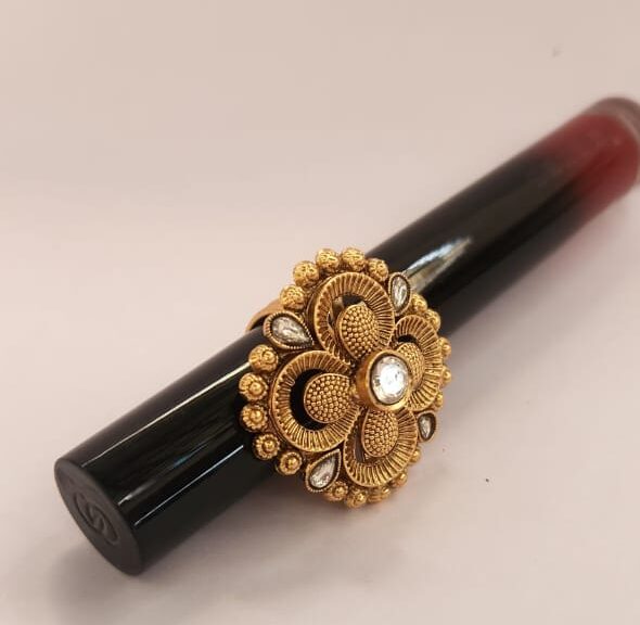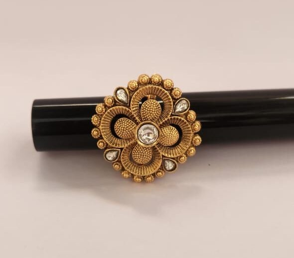 A beautifully crafted big floral ring with delicate detailing and shining kundan stones around the center. Designed to give a grand and glamorous look, this ring is ideal for weddings, parties, or festive wear.