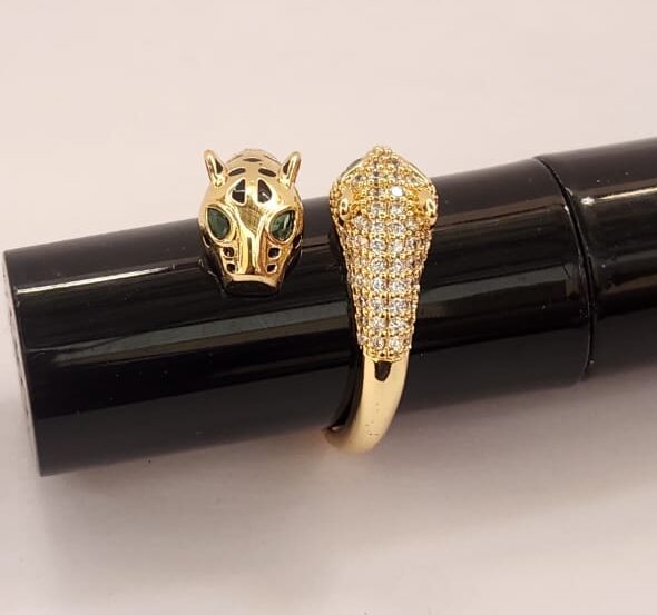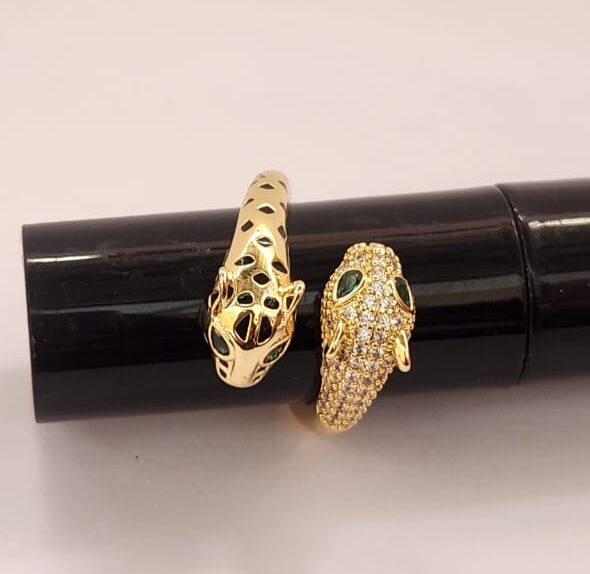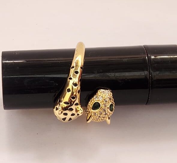 A bold leopard-design ring with glossy golden finish and sparkling stones. Trendy statement jewelry for girls who love a fierce and fashionable look.