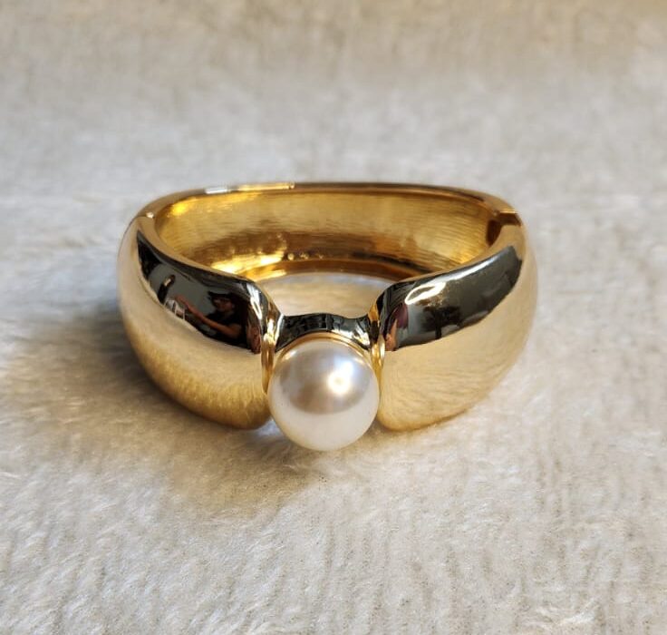 A sleek gold bracelet adorned with a delicate pearl at the center — simple, royal, and timelessly elegant.